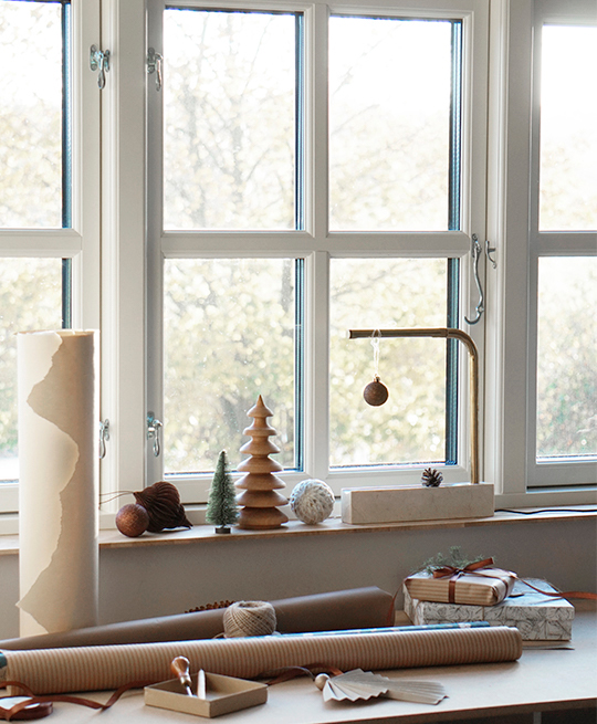 Vid ett fönster med vackra spröjs på första våningen, har frilansande hemstylisten och textförfattaren Kristinna Andreasen skapat en liten verkstad för årets julklappsinpackning.