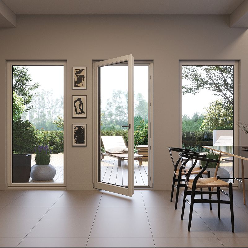 Våra fönster och dörrar kan beställas i olika material - trä, trä/aluminium eller PVC. Nedan kan du se vilket material denna modell erbjuds i.