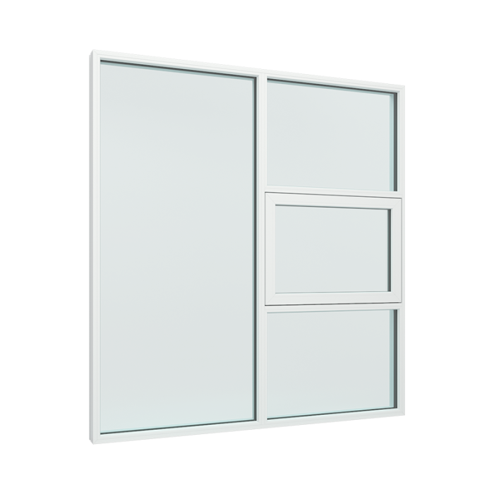1x3 glasfält och glidhängda fönster mitten, samt 1 fält med 1 glasfält (PVC-U2-13-TM-11)