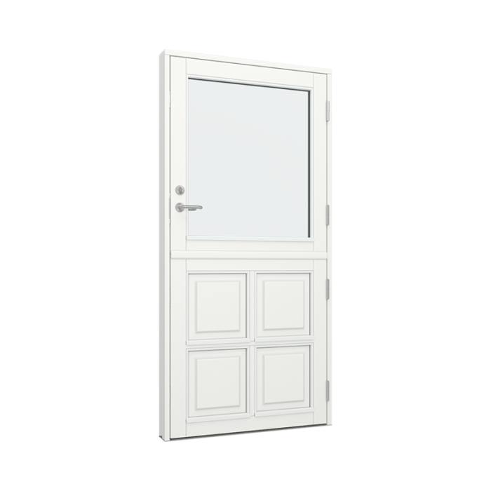 Var uppmärksam på att halvdörrar alltid öppnas utåt. På den nedersta del av dörren är det monterat ett spanjolett handtag och på översta halvdelen är det monterat handtag och cylinder