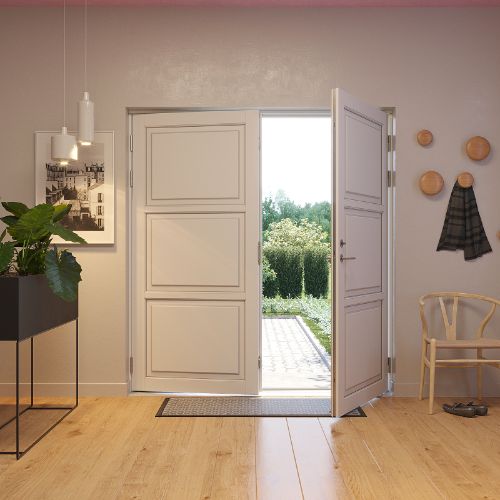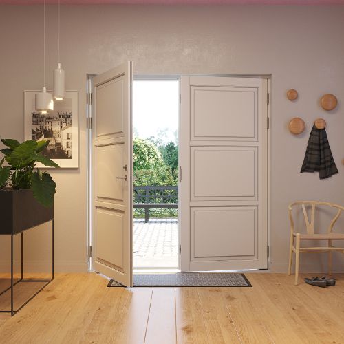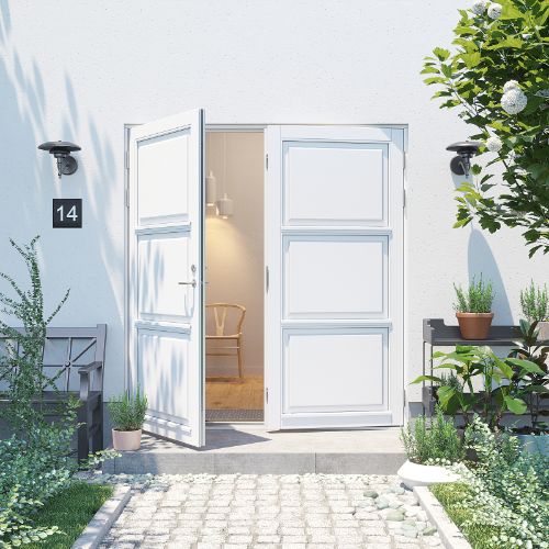 Bemärk: Vid inåtgående dubbeldörrar När du skall välja öppningsrettning på din dubbeldörr, är det viktigt att du kontrollerar, om dörren kan riskera att bli utsatt för regn och blåst utan möjlighet för lä. Konstruktionsmässigt kan diubbelt inåtgående dörrar nämligen inte säkras 100% mot vattenintängning vid väder som skyfall. För att säkra optimal täthet skall 3 punktlåsen vara aktiverat och vi rekomenderar alltid utåtgående dörrar omden inte står i lä. Det ges inte garanti mot vattengenomträngning på bakgrund av ovanstående förhållanden. Det är normalt att branchen tar förbehåll för detta. Vi har valt att göra detta förbehåll mer synligt, så de kan välja utåtgående dörrar.