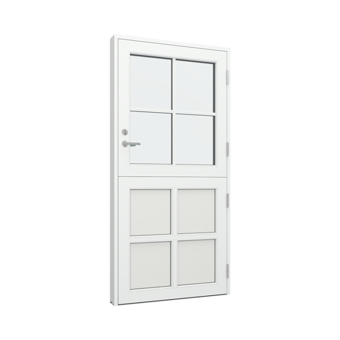 Var uppmärksam på att halvdörrar alltid öppnas utåt. På den nedersta del av dörren är det monterat ett spanjolett handtag och på översta halvdelen är det monterat handtag och cylinder